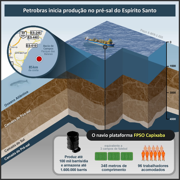 Segurando orgulhosamente um pequeno barril com amostra de petróleo retirado do Campo de Baleia Franca, primeiro poço do Pré-sal a entrar em produção no Brasil, o presidente Lula afirmou ser hoje um dia histórico para a Petrobras, para a tecnologia brasileira e para o País. “Esse pequeno barril simboliza a independência que o Brasil terá no futuro”, disse ele em curto discurso em Vitória (ES) após visitar a plataforma da Petrobras que fica a 85 quilômetros do litoral capixaba. O poço começará a produzir cerca de 13 mil barris de petróleo leve por dia – devendo chegar à produção de 20 mil barris por dia até o final deste ano.