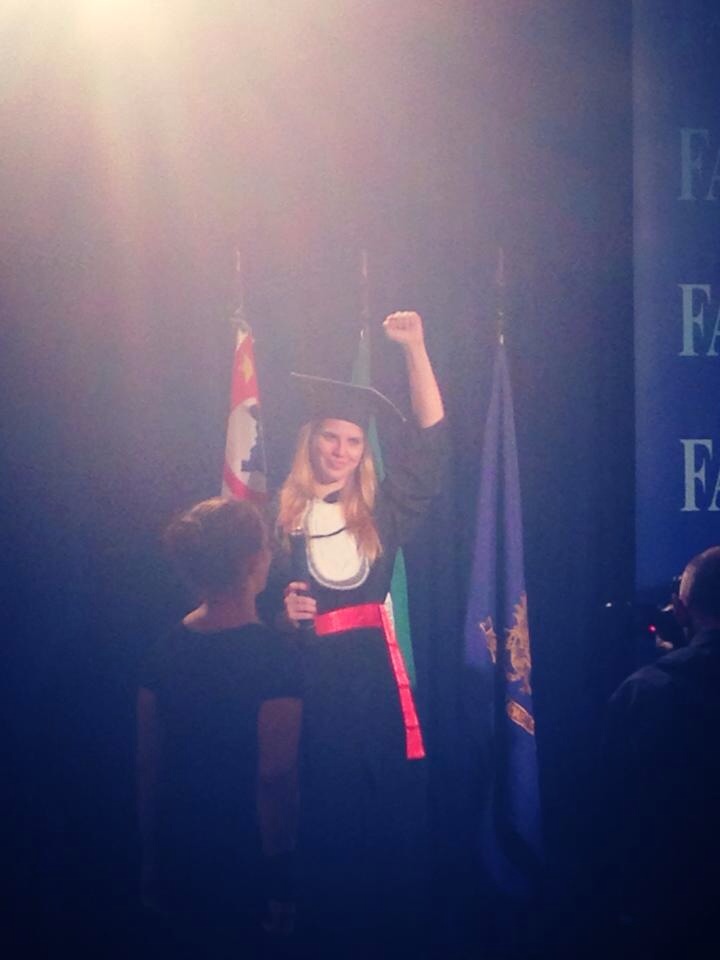 Na formatura, ela virou notícia ao replicar o gesto do pai de erguer o braço esquerdo em sinal de resistência ao receber “o canudo”, como ela chama o diploma.