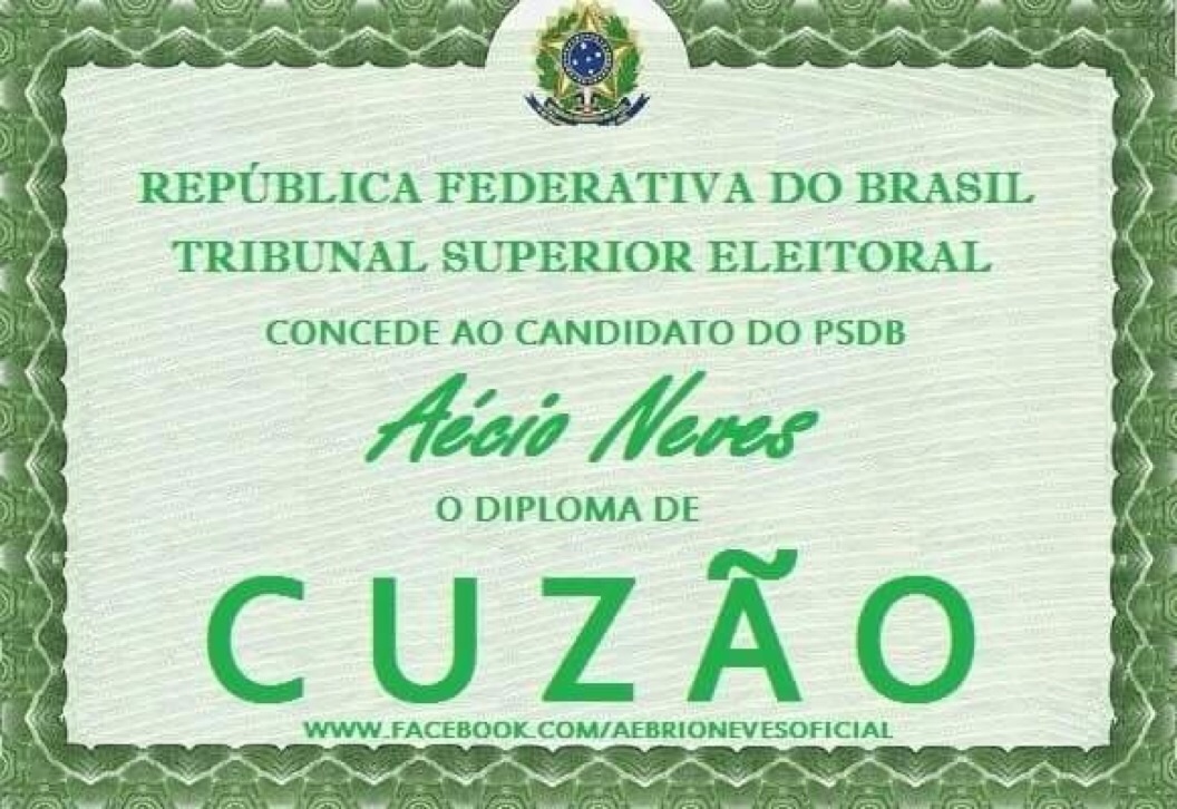 Peço licença a mamãe para reproduzir o que diz a imagem. É um diploma igual ao que Dilma recebeu. E está dito ali que Aécio Neves foi solenemente diplomado CUZÃO, com maiúsculas.