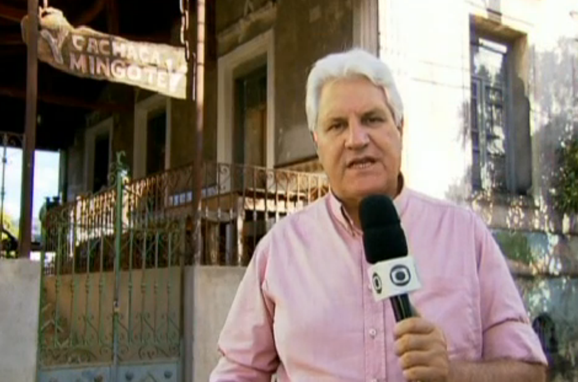 Valmir Salaro, do Fantástico, em frente à fazenda Mingote