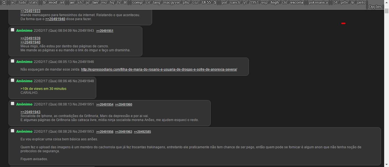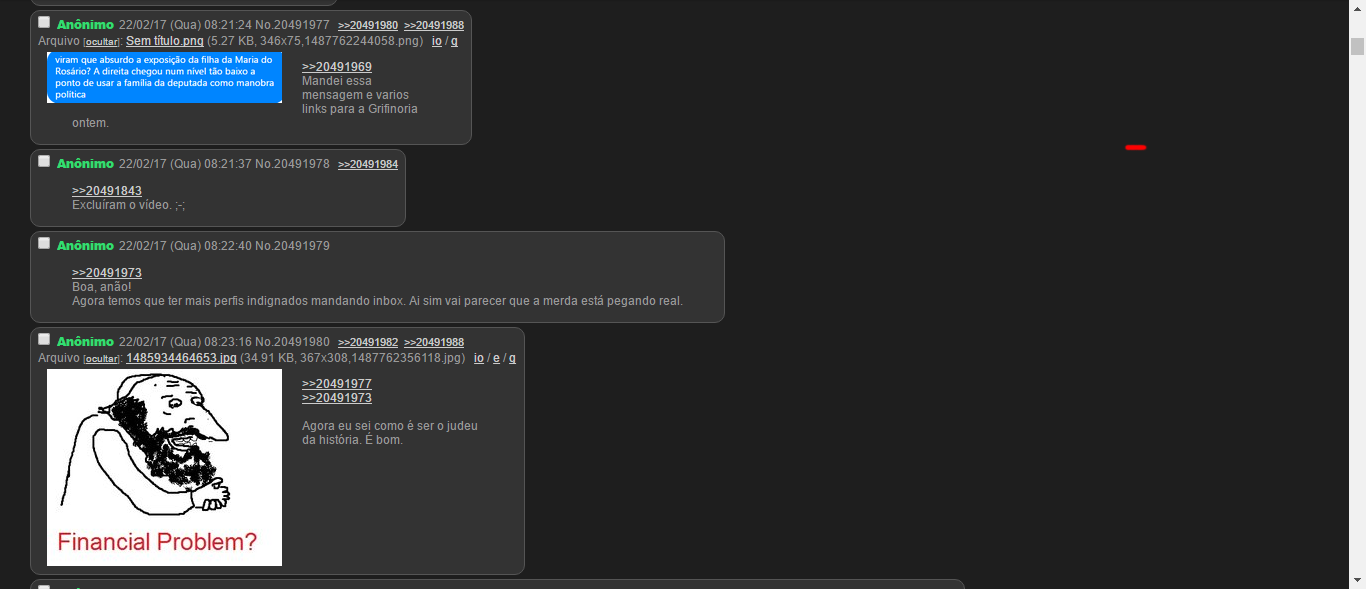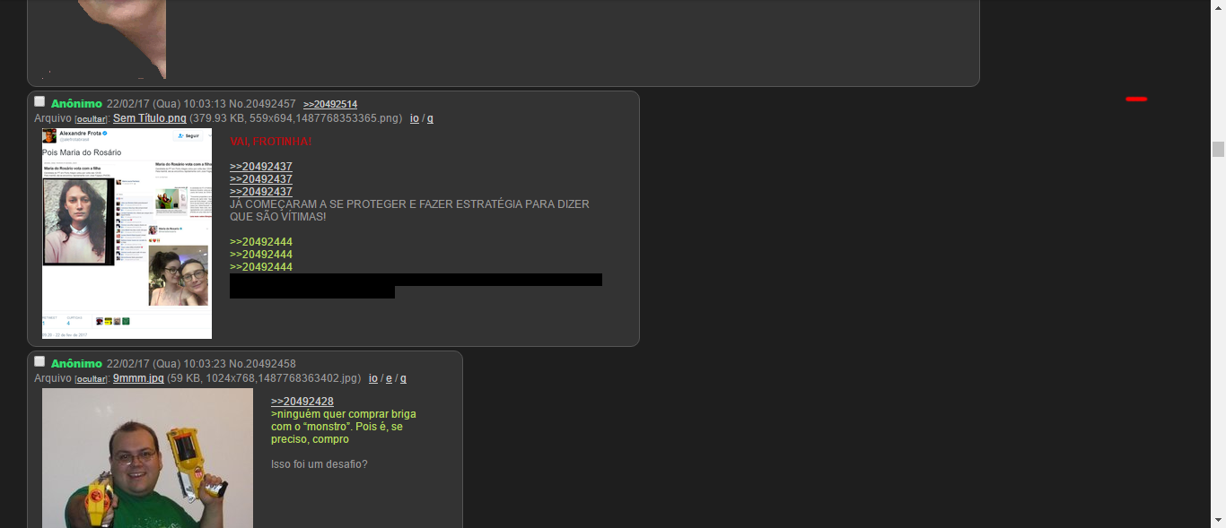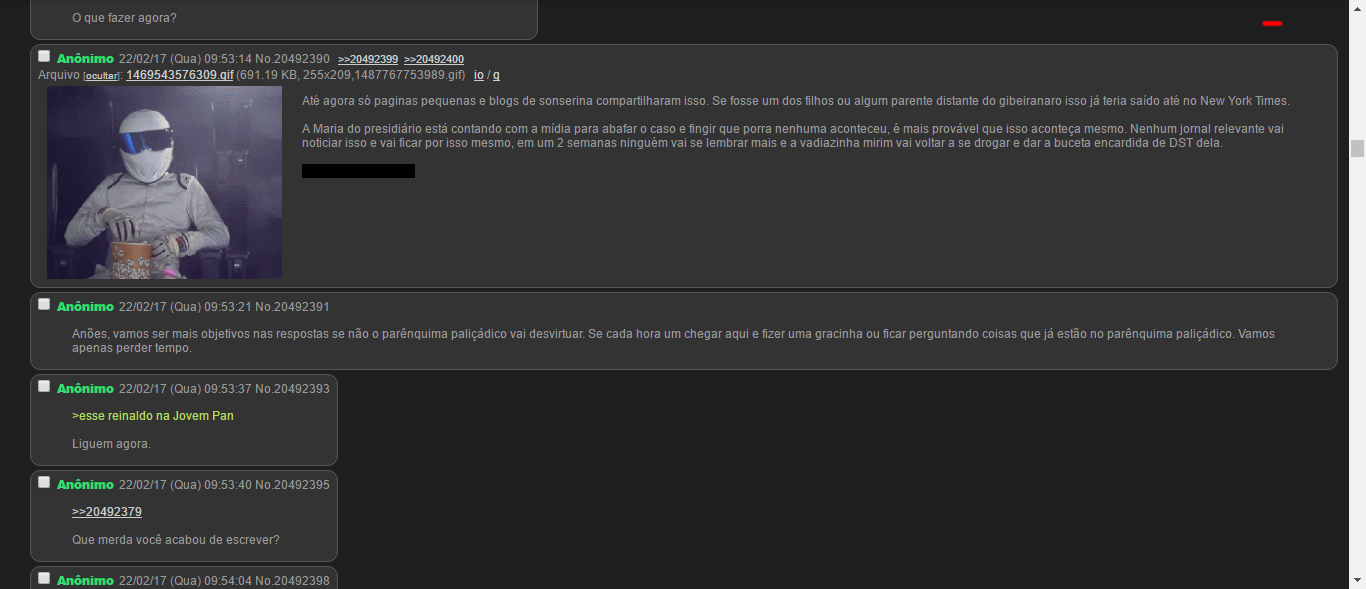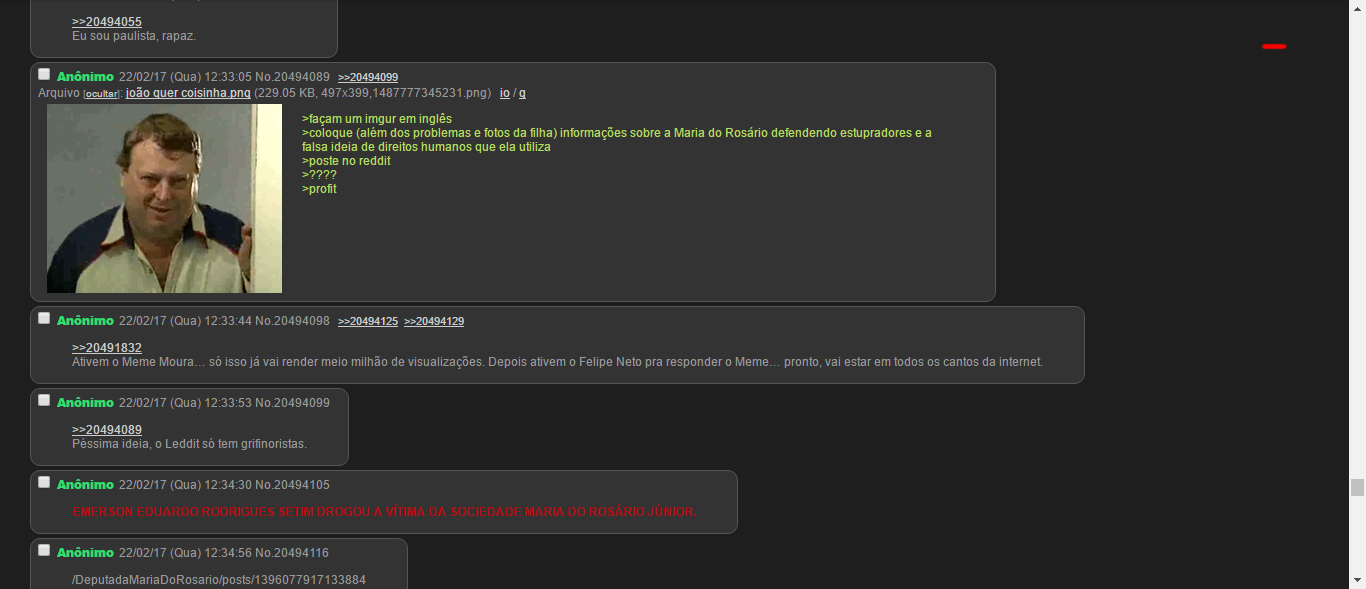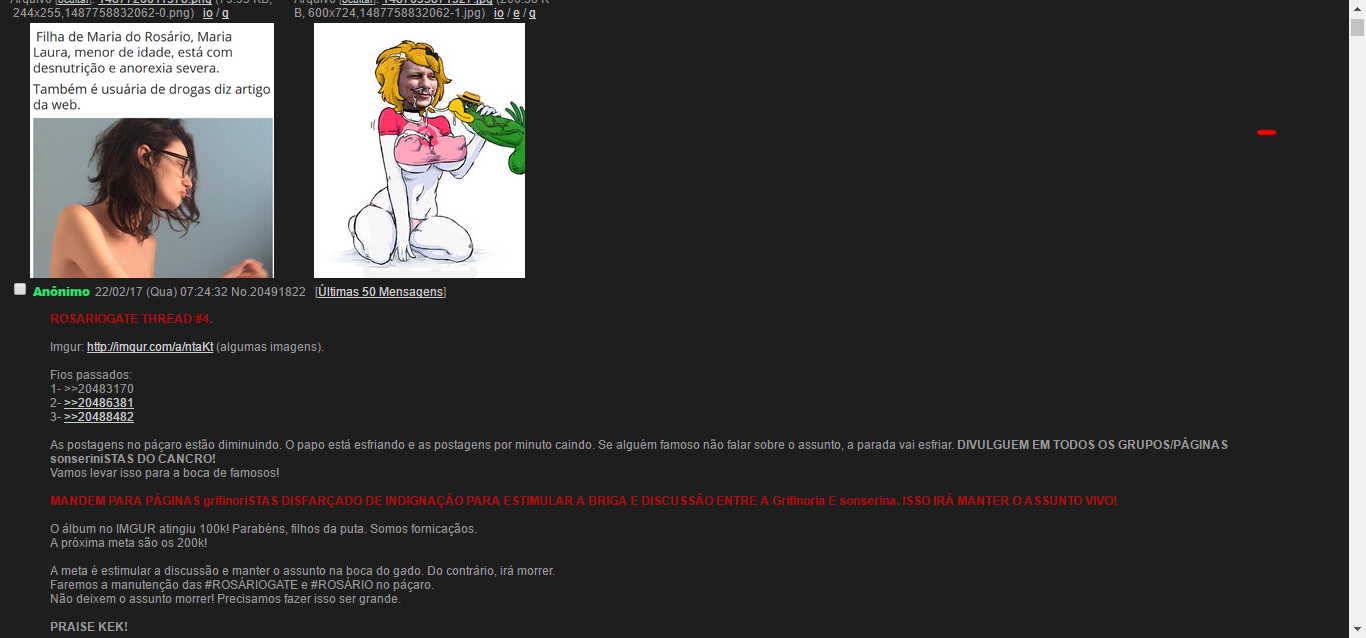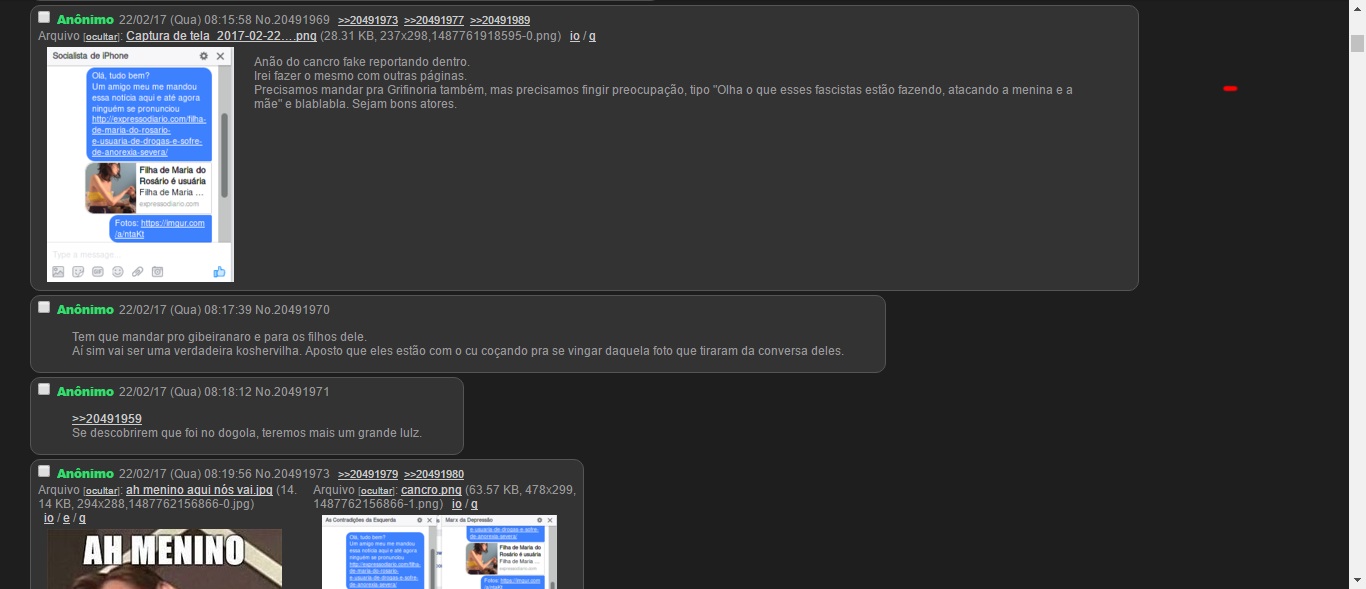 Os caluniadores se reúnem no site 55chan, conhecido por ser um antro com toda sorte de conteúdo racista, homofóbico, antissemita, militarista e pornográfico.